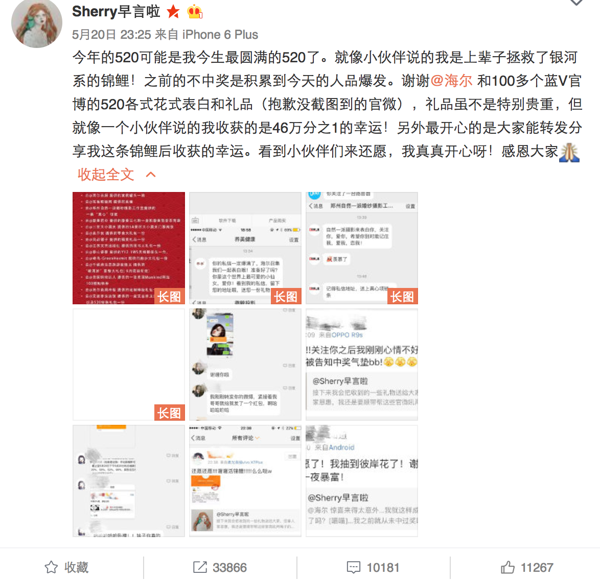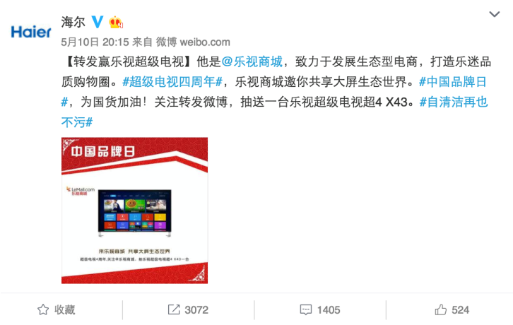 520表白日,海爾搞了一個(gè)事情,聯(lián)合60多家藍(lán)V,給一位幸運(yùn)粉絲送禮物。這條轉(zhuǎn)發(fā)評(píng)論送禮物的微博在半個(gè)小時(shí)之內(nèi)就轉(zhuǎn)發(fā)過萬。